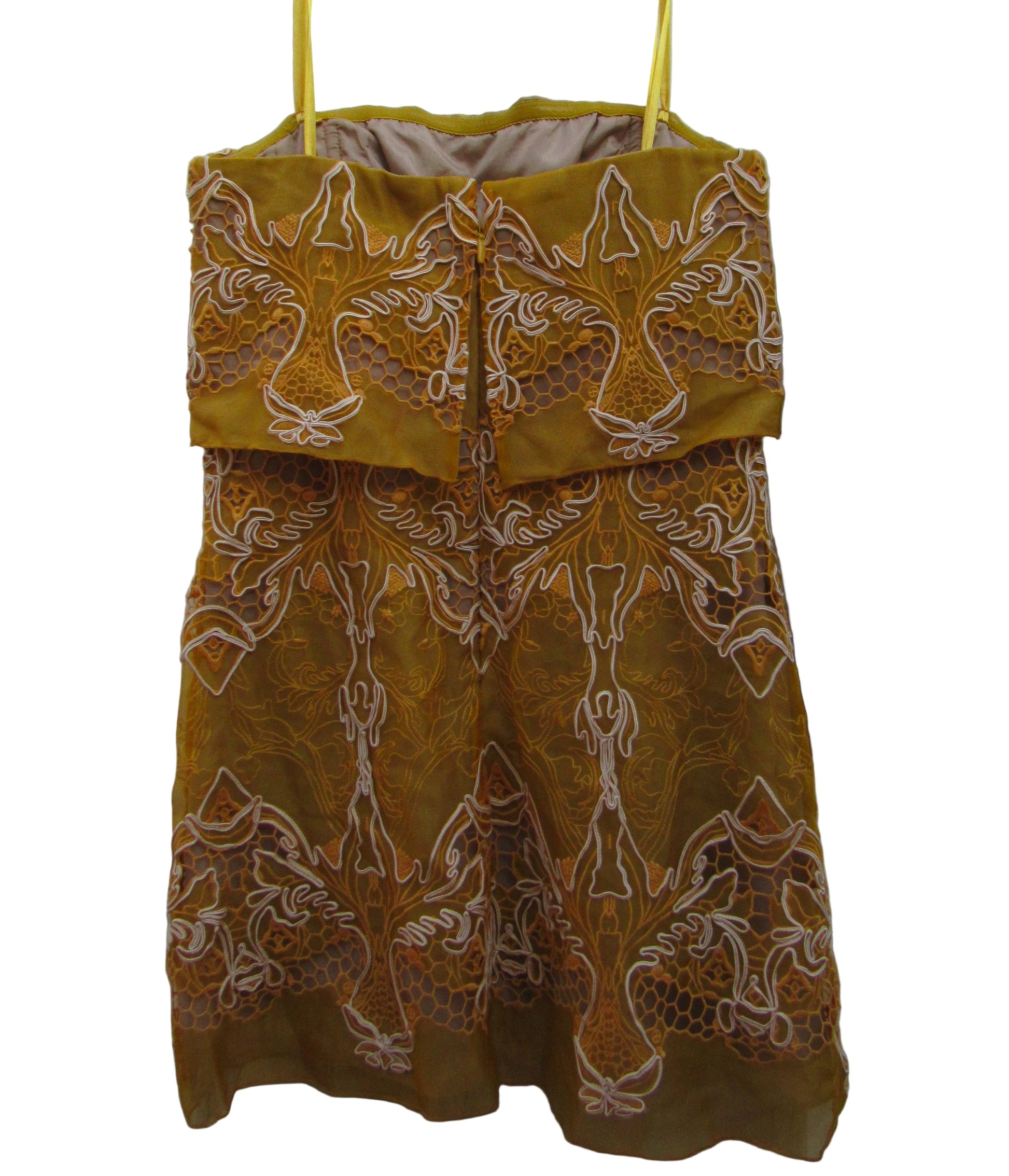 This BCBGMAXAZRIA Runway Samantha dress is the perfect choice for any cocktail or party event. The dress comes in a beautiful curry color with intricate floral embroidery and features an off the shoulder neckline and sleeveless design. It is made of 100% silk and should be dry cleaned only. The dress is a size 2 and has a zip closure for easy wear. The strapless design and short dress length make it perfect for a summer occasion. This dress is an elegant choice for anyone looking to make a statement.